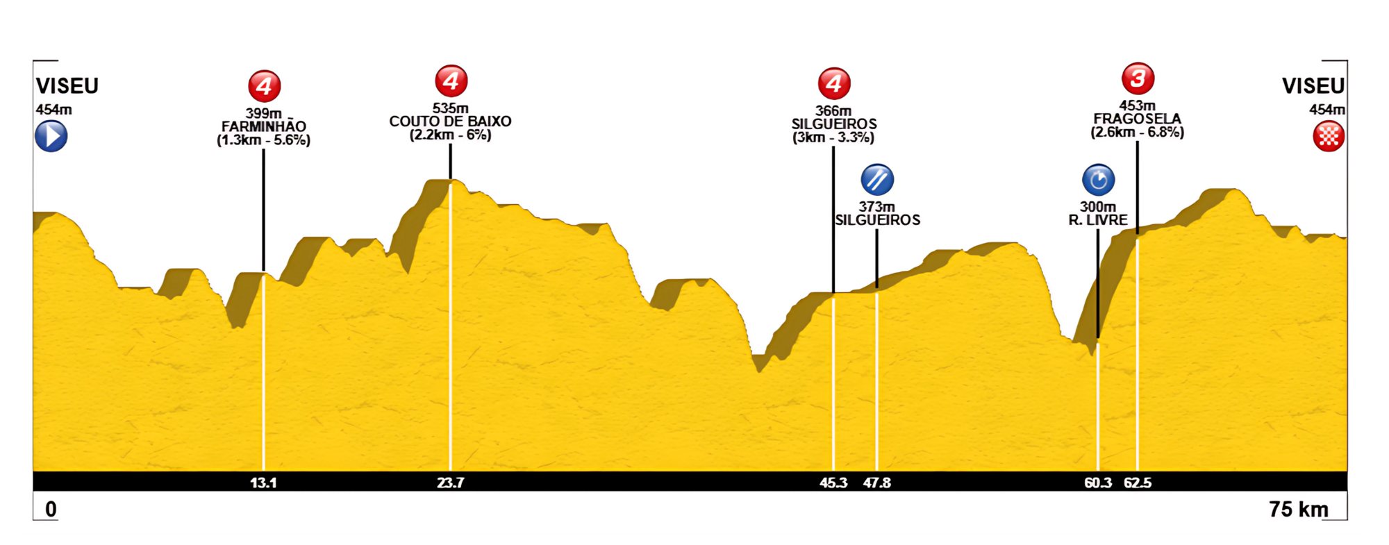 La subida que marca el pistoletazo de salida al tramo libre comienza prácticamente em el Rio Dão e(Km 60) y las Termas de Alcafache hasta croonar Fragosela. Es una subida constante de 2,6 km al 6,8% de pendiente media. La mayor dificultad puede estribar en que se pedaleará por una carretera orientada al sur, en un valle caluroso y húmedo sin apenas sombras, que mejor que no sea excesivo el mercurio para no cocernos en el horno. Se llega a la cima en Fragosela (Km 63), cerca de la rotonda de Alcafache y el Polígono industrial de Coimbrões. Tras girar a la izquierda para pasar bajo la IP5, se asciende un poco más y luego todo se vuelve más fácil, con una ruta que tiende a descender hasta la meta.