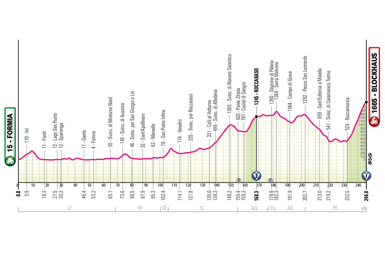 La llegada a Italia significará la aparición de las primeras dificultades serias. Dos etapas de media montaña pero sin una dureza excesiva y con un kilometraje muy corto recorren el sur de la bota. La primera con la subida a Cozzo Tuno (todo un primera, con 14 kms al 6,4%) A 40 kms de meta, y la segunda con el muy corto pero muy empinado Montaña Grande a 50 kms del final. Después, llegada llana a Napoles para preparar la gran etapa del Giro… por distancia. 246 kms (doscientos cuarenta y seis kilómetros, esto no se veía en una gran vuelta desde hace décadas) por un terreno quebrado, la subida sin puntuar a Rioniero Sannitico (10 kms al 5%) y la que sí lo hace a Rocarasso (9 kms al 5,5%) antes del durísimo final en Blockhaus con 8 kms centrales al 9% y (previsiblemente) 6 horas de etapa en las piernas. El día siguiente habrá una etapa quebrada para fugas con subida final en Fermo antes de final en Corno alle Scale. Una subida con solo 4 kms finales exigentes y que pondrá fin al primer bloque de la carrera.
