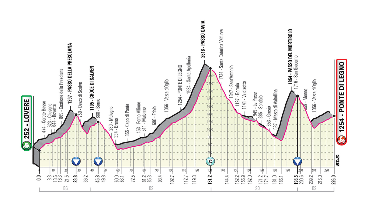 ¿Se acaba la dureza? No. Tras un perentorio descanso, llega la etapa reina: 225 kms con cuatro puertos: los modestos Croce de Salven y Presolana y los mastodontes Gavia Y Mortirolo. 225 kms de etapa y el Giro aún quedará por decidir. Más media montaña camino de Anterselva, con subidas modestas pero exigentes, antes del final en alto.