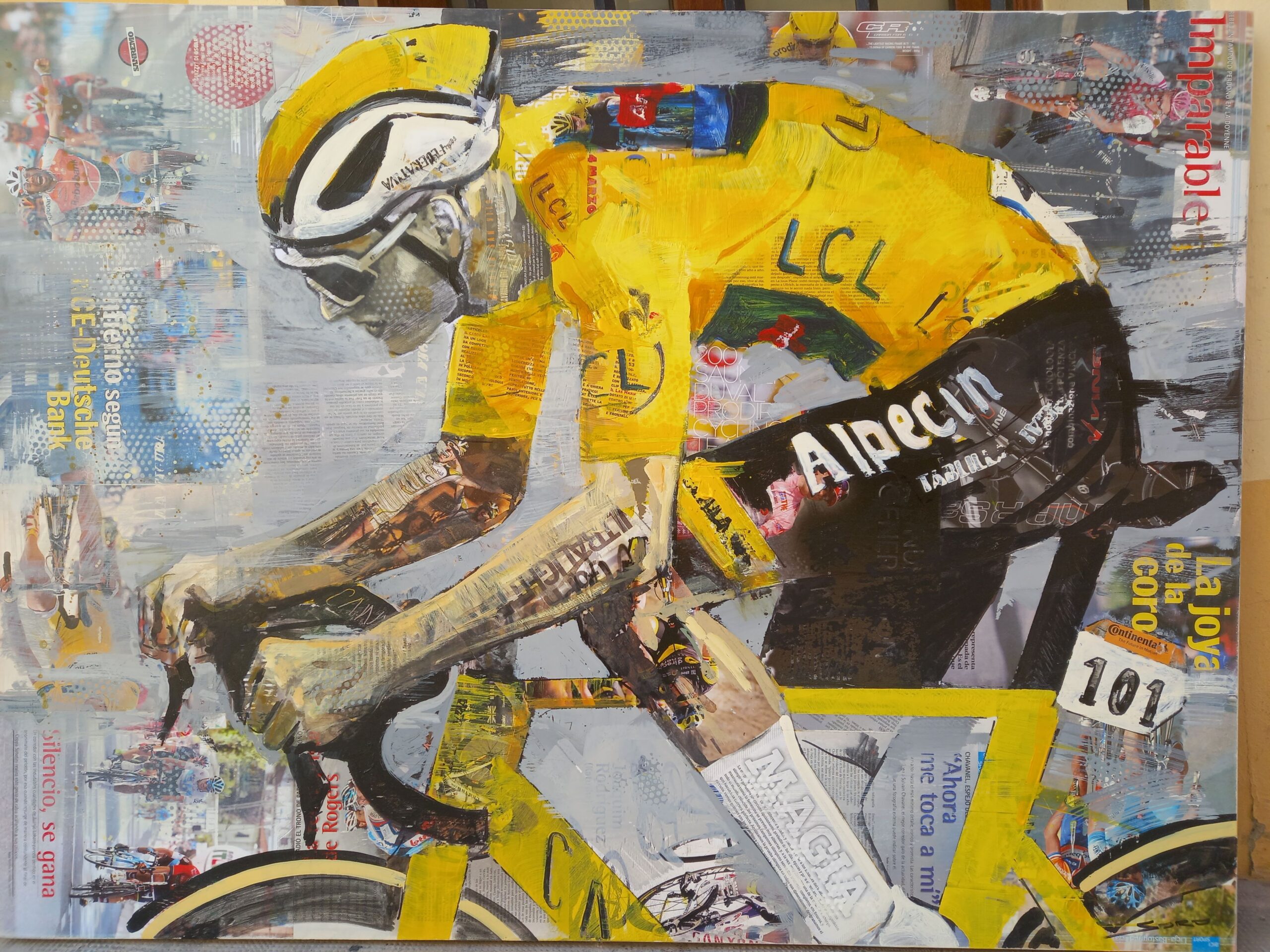 Actualmente mi obra se centra en un noventa por ciento en el ciclismo, aunque empecé con paisajes, los cuales sigo haciendo junto con algunos retratos. De hecho, aquí en Xátiva, hay mucha tradición de pintar al natural y formo parte de un grupo llamado «a l’Aire Lliure» con los que salgo mucho a dibujar a la calle. Pero lo que me permite vivir del arte es el ciclismo, donde empecé a probar diversas técnicas aunque ahora utilizo fundamentalmente el «collage», que me gusta mucho porque vas pegando recortes, artículos, fotos ciclistas y combinándolas con la pintura, con unos resultados que sorprenden mucho.