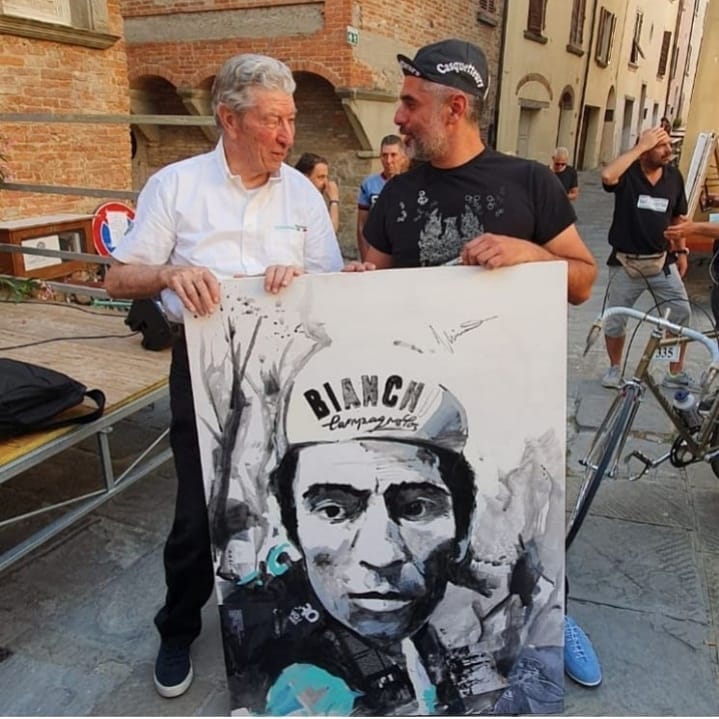 Han viajado a muchos sitios. Hay obra mía en Italia, donde más trabajo, Francia, Reino Unido, Portugal, Canadá, California e incluso Dubai, pero allí más de paisaje, y por supuesto, en España. He mostrado mi obra en el Tour de Francia, en Pau, donde expuse entre la etapa contrarreloj de la carrera francesa y la de la Vuelta, en el verano de 2019. He expuesto en Estados Unidos o Canadá (aquí, para el récord de la hora de Giuseppe Marinoni a sus ochenta años), pero para mí, la «Exposición», con mayúsculas, ha sido en el centenario del nacimiento de Fausto Coppi, en el Museo de le Biciclette de Alessandria. En España he expuesto en todas las grandes ciudades y también muchas veces en manifestaciones de bicis clásicas, como las marchas retro Pedals de Clip, Histórica o Eroica. Decir que muchos ciclistas ya retirados tienen obras mías, como Bruyneel, Ángel Casero o Eusebio Unzue, pero como ya os he comentado, en Italia es donde mi arte es quizá más apreciado. Por ejemplo, la hija del fallecido Felice Gimondi tiene varias de mis obras, algunas ya compradas por él, y Francesco Moser tiene media docena de cuadros en su espectacular museo-bodega en Trento, que recomiendo encarecidamente visitar.