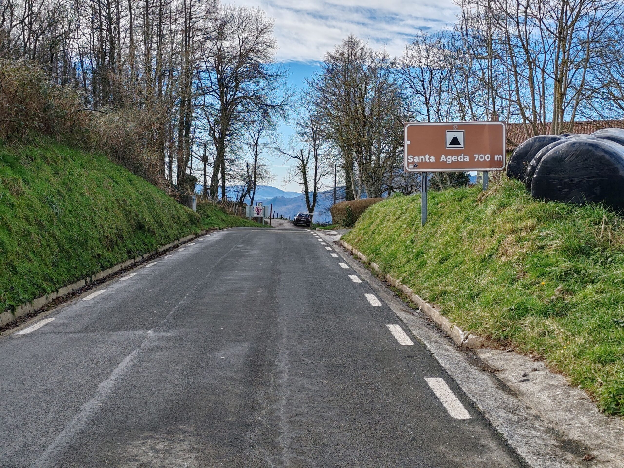 Sin embargo, pasado este último desvío entramos en una zona boscosa que ya nos acompañará hasta la cima. Casi completando el kilómetro cinco, a la espalda del caserío de Santutxo, sale la carretera hacia Santa Ageda, pasando a ser carretera de un solo carril. En este tramo hay un corto descenso hasta el desvío que no tomaremos a Santa Marina, antes de los tres kilómetros finales, que van cogiendo pendiente según se asciende, rozando el último kilómetro el 9 %. En la cima se abre un poco el entorno, al alcanzar los campos del pequeño núcleo urbano de Santa Ageda, que da nombre al puerto.
