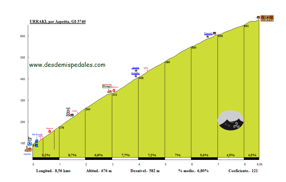 En este caso, al contrario que en su vecino más al sur, lo más duro está al principio, con dos kilómetros superando el 8 %, el segundo rozando el 9 %. Coincide este primer tramo con la zona donde aún se mantienen reminiscencias urbanas, por el polígono que dejamos a la derecha. En la segunda horquilla pasaremos junto a un vertedero, afortunadamente bien tapado a nuestra visión.