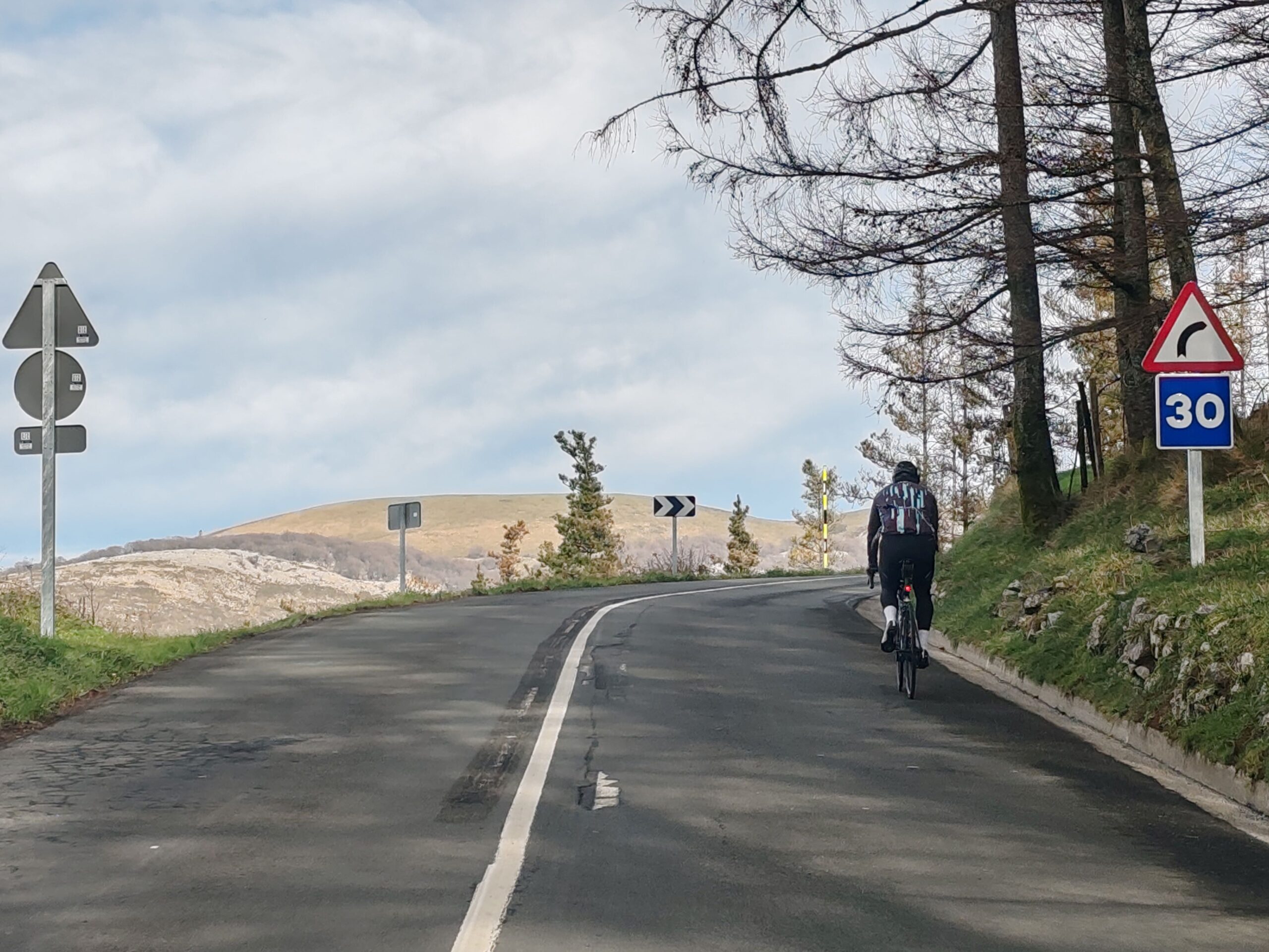 Iremos saltando de un caserío a otro hasta llegar a Elosiaga, donde hay un pequeño descanso al paso por el desvío a una sidrería. Venimos de un kilómetro casi al 7 %, y los tres siguientes superarán esa cifra. Al final del primero de ellos pasaremos por el cruce que nos llevaría a Ibarbia y Urrestilla, dos variantes del puerto con tramos de hormigón y mucha pendiente, para los más atrevidos.