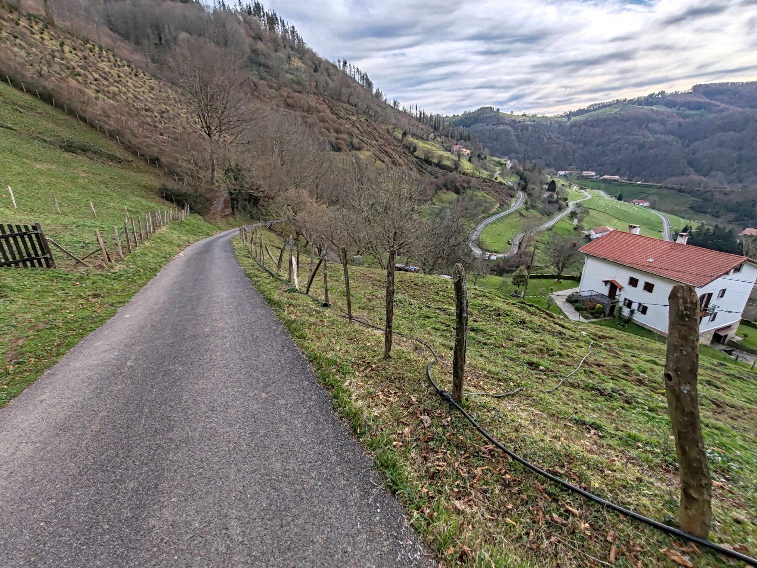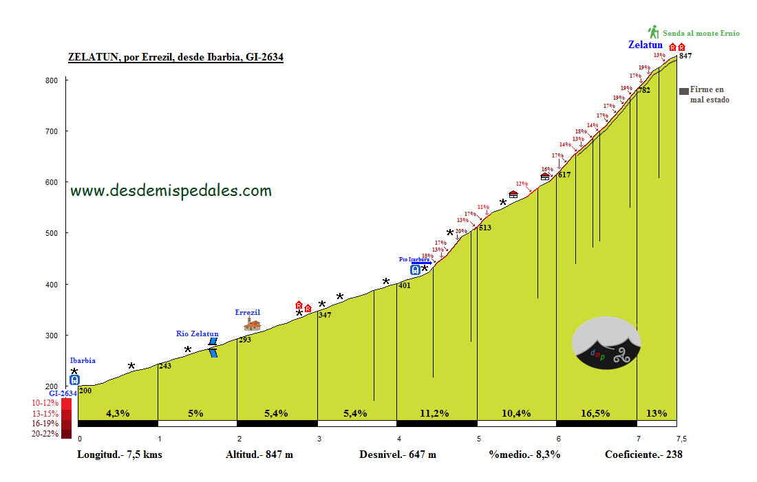 Comenzamos la altimetría junto a la parada de autobús de Ibarbia, aunque algo de altura hemos ganado desde Azpeitia. Tampoco ganaremos mucho más hasta Errezil, pues nos moveremos por cifras inferiores al 5 %. El paso por el pueblo es bastante rápido e incrementa algo la pendiente. En cuanto al paisaje, como en los demás puertos, zona de prados salpicada por caseríos. En esta zona transitaremos por dos horquillas, siendo la segunda el punto de comienzo de los kilómetros finales que nos deberían llevar a la máxima exigencia.